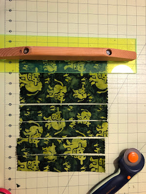 Start by cutting your fabric into 1.5 inch by 9 inch strips- this can be an approximation. The rotary cutter is your best friend.